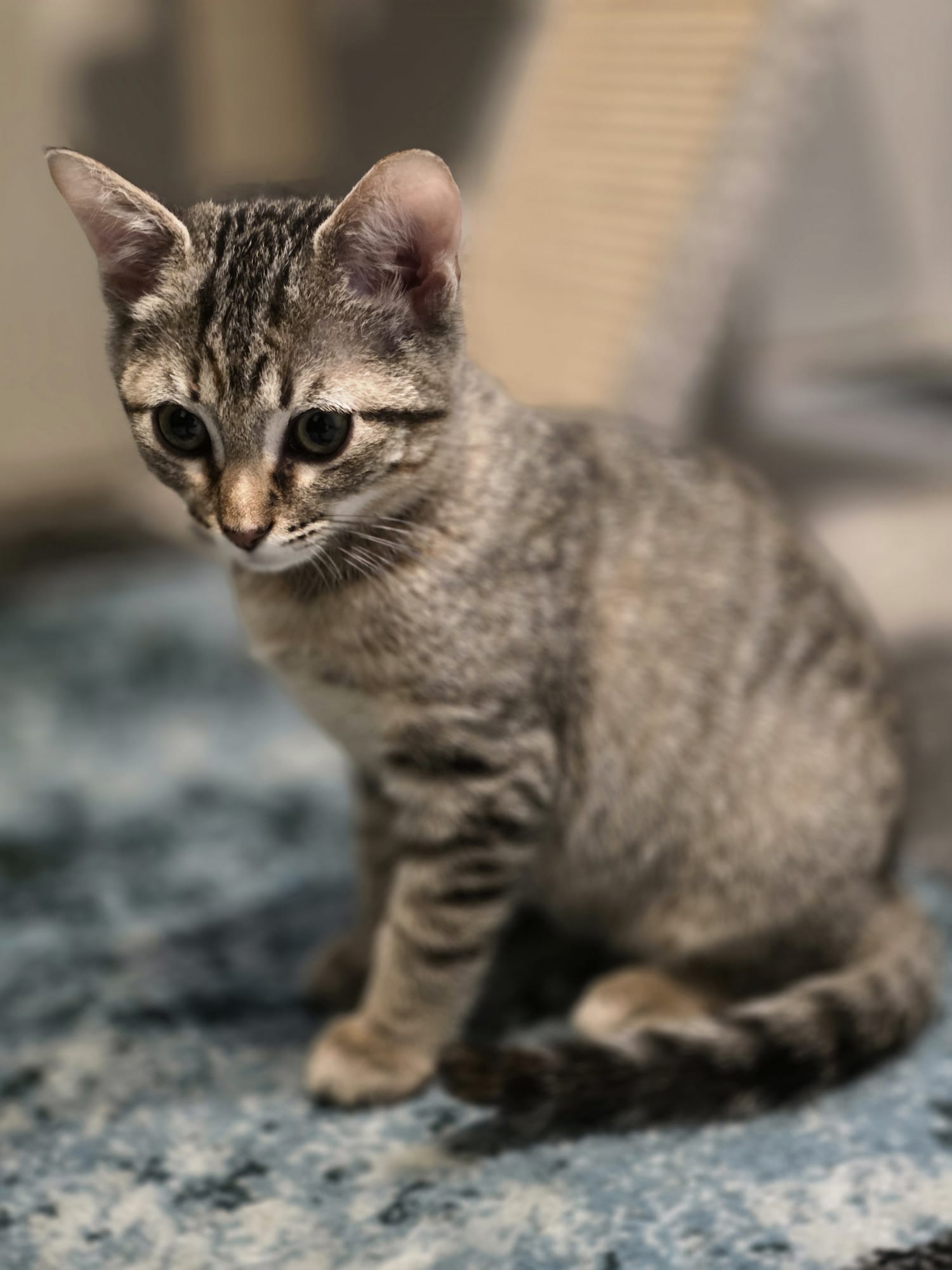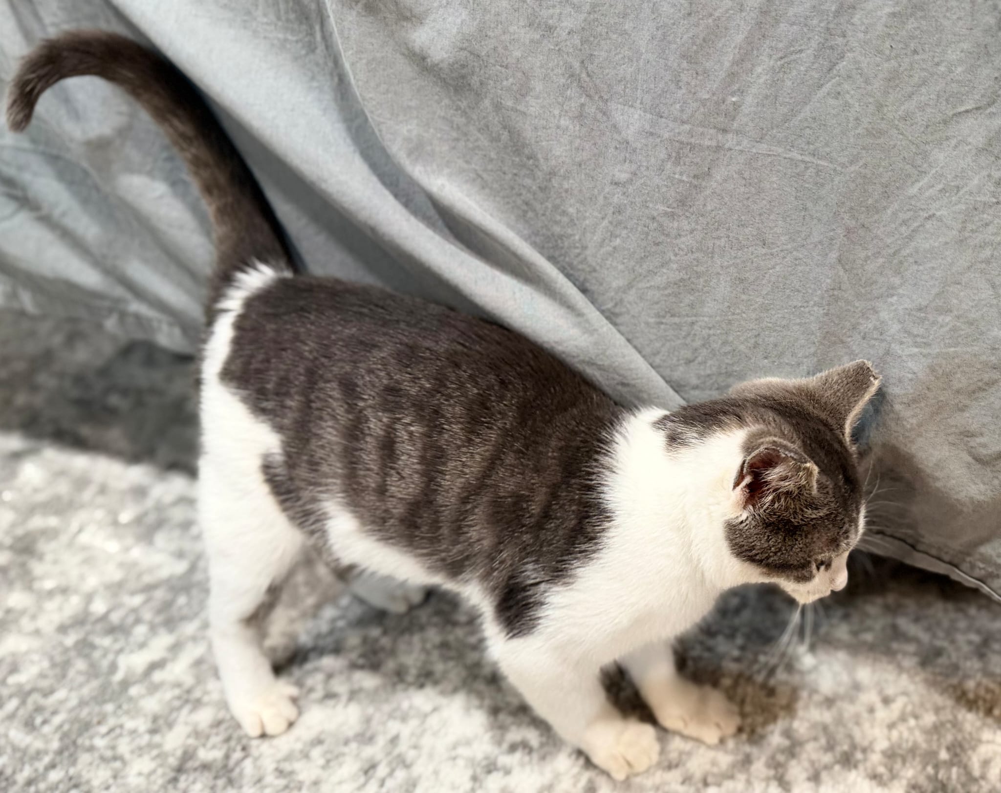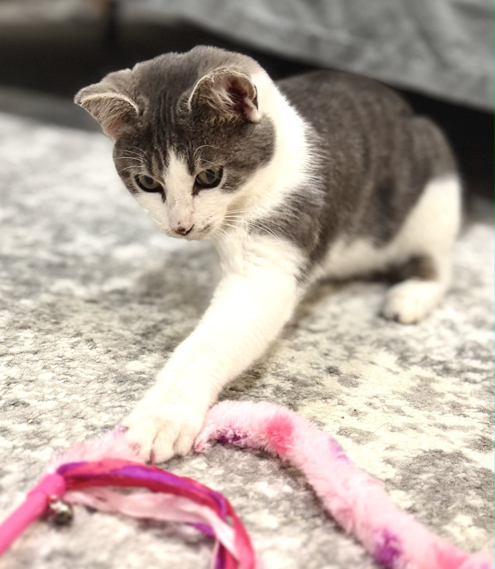 Her nystagmus gives her a unique look, like she’s always taking in the whole room… but this girl can CHASE, POUNCE, and PLAY just like any other kitten. Maybe even harder.