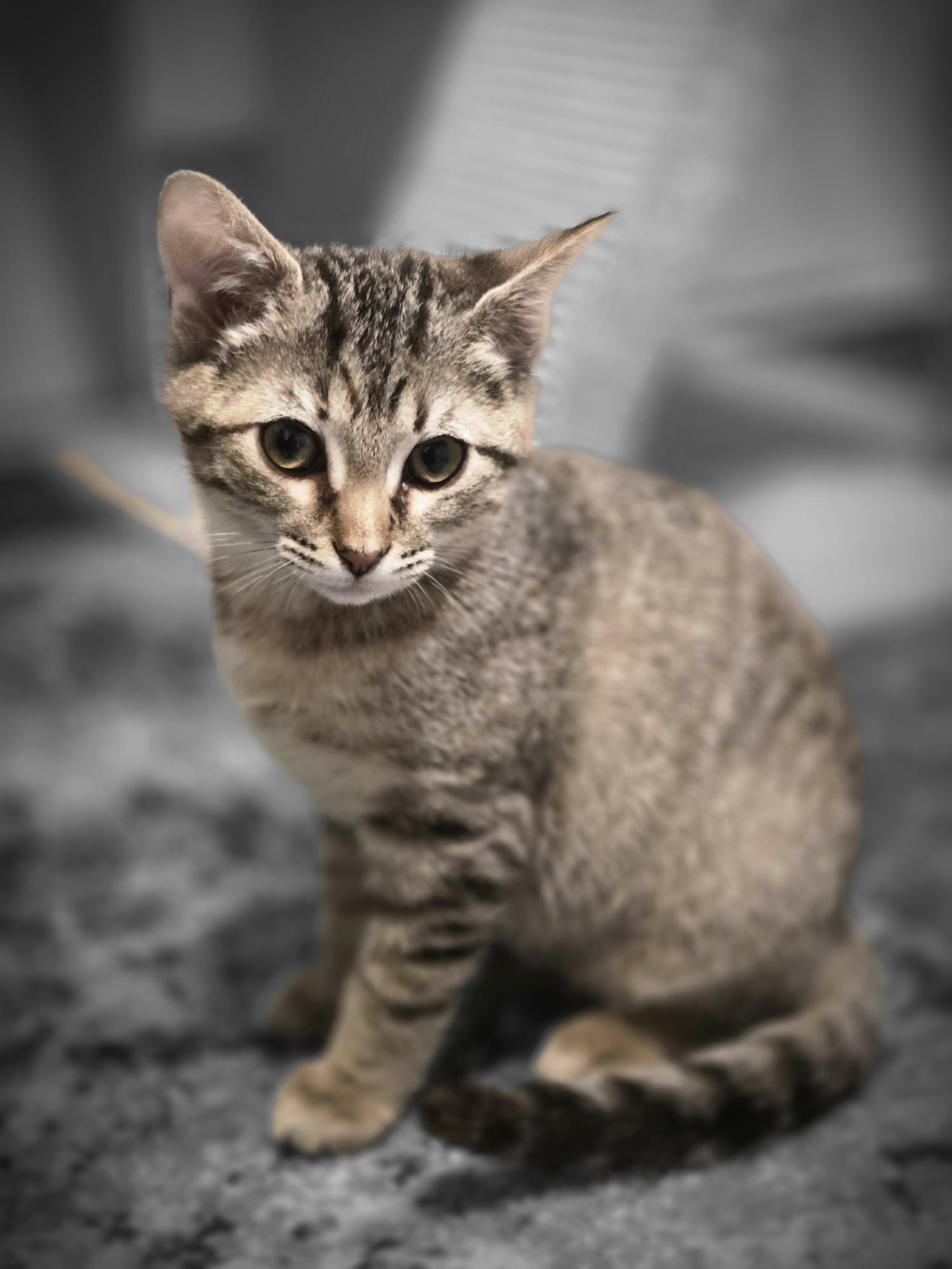 Bio: Bindi is a tiny wild child with bold Scottish-straight–style eyes, petite legs, and a fearless spirit. As the youngest kitten from the Homeless Camp colony, she had a rough start, including trauma from a camp fire. But she is healing beautifully in a safe, indoor environment.